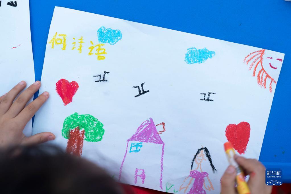 9月9日,在四川省石棉縣新民鄉海耳村臨時(shí)安置點(diǎn),小朋友在畫(huà)畫(huà)。