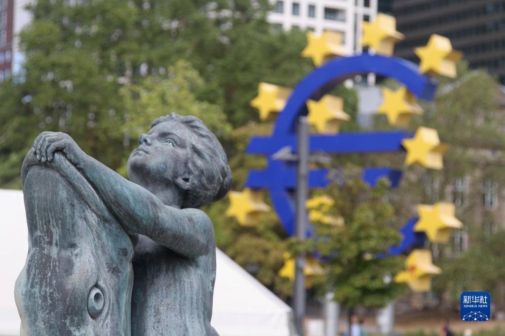 這是9月8日在德國法蘭克福拍攝的歐元雕塑和一座噴泉雕塑。