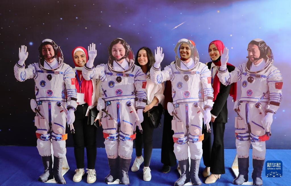 9月6日,在埃及開(kāi)羅,埃及青年學(xué)生在“天宮對話(huà)”活動(dòng)埃及分會(huì )場(chǎng)拍照。