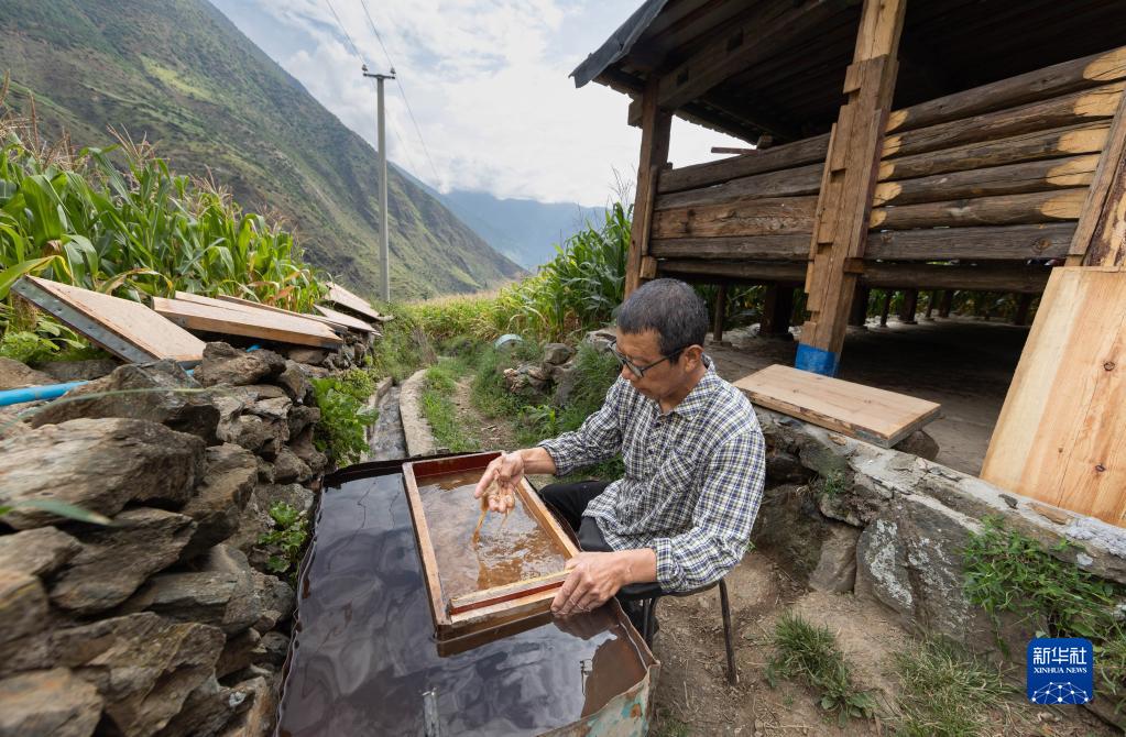 英扎次里將反復舂過(guò)的樹(shù)皮放在木框中(9月5日攝)。