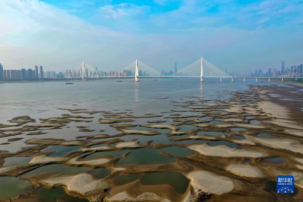 9月10日,長(cháng)江武漢段部分灘涂裸露(無(wú)人機照片)。