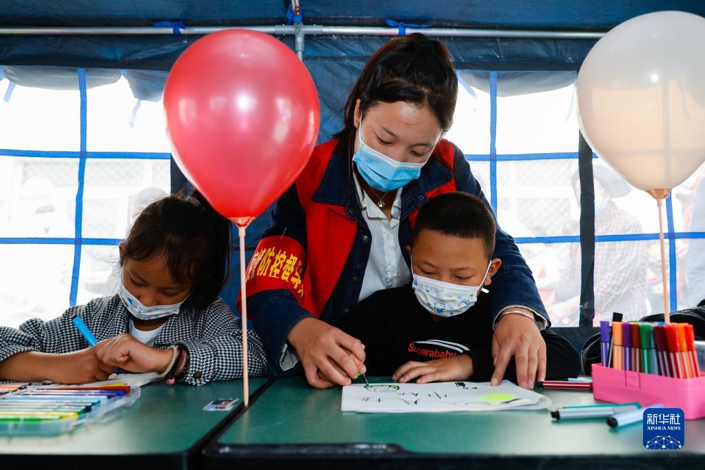 9月10日,在瀘定二中臨時(shí)安置點(diǎn)的“帳篷課堂”里,老師志愿者孫燕(中)在教孩子畫(huà)畫(huà)。