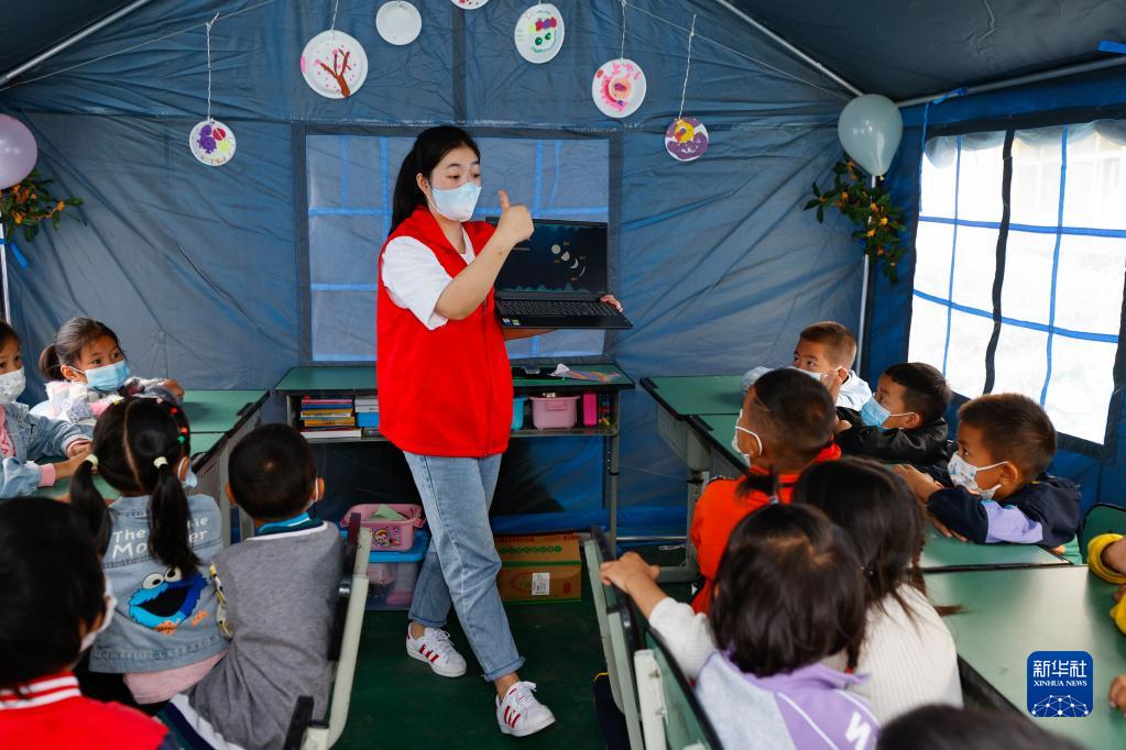 四川瀘定地震發(fā)生后,瀘定縣第二中學(xué)校成為臨時(shí)安置點(diǎn),安置了受災嚴重的得妥鎮的800多名村民,其中約有50名孩子。自9月6日開(kāi)始,11名來(lái)自瀘定縣幼兒園和冷磧鎮幼兒園的老師帶領(lǐng)10名大學(xué)生和高中生組成志愿者服務(wù)團,在提供志愿服務(wù)的同時(shí)照料、陪伴這些孩子。