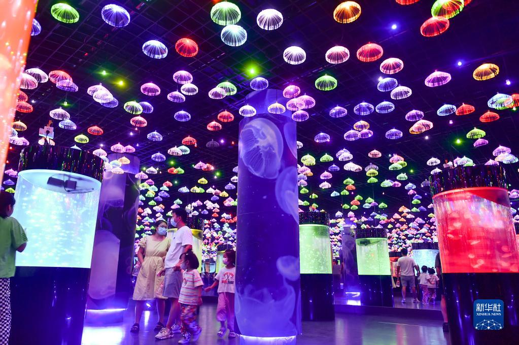 9月10日,市民和游客在河南省洛陽(yáng)市龍門(mén)海洋館水母館游覽。
