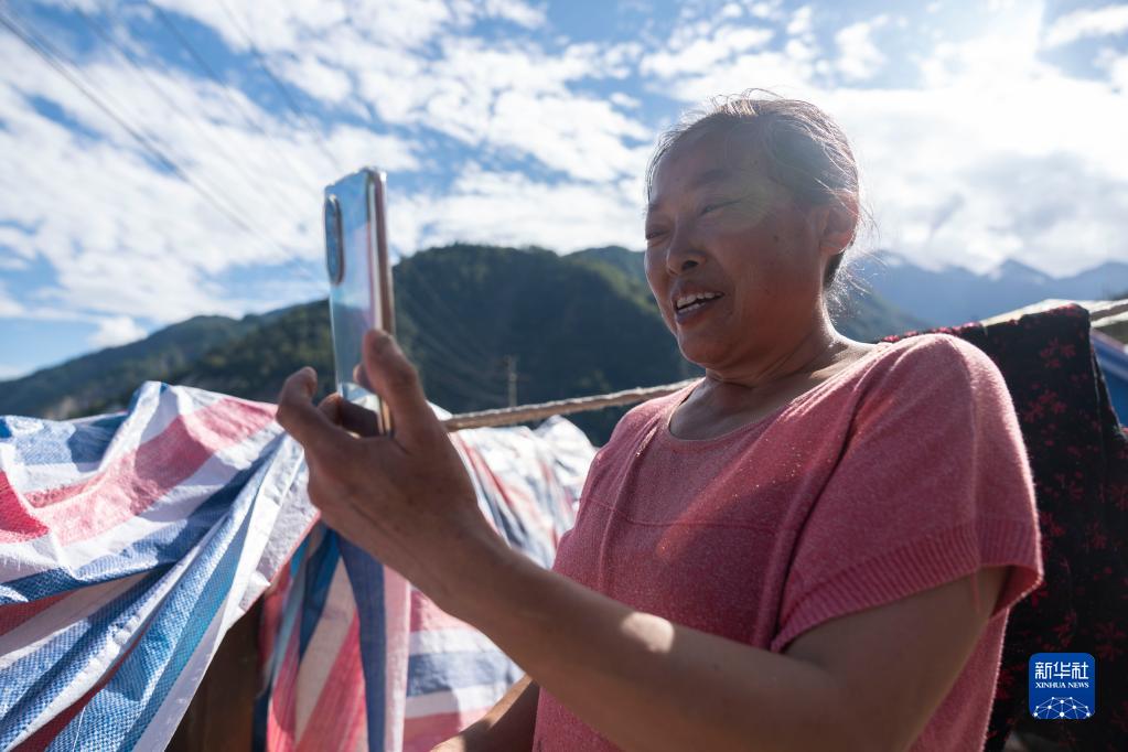 9月10日,在四川省石棉縣王崗坪彝族藏族鄉幸福村,技術(shù)人員安裝衛星便攜站后,村民在與家人用手機進(jìn)行視頻通話(huà)。