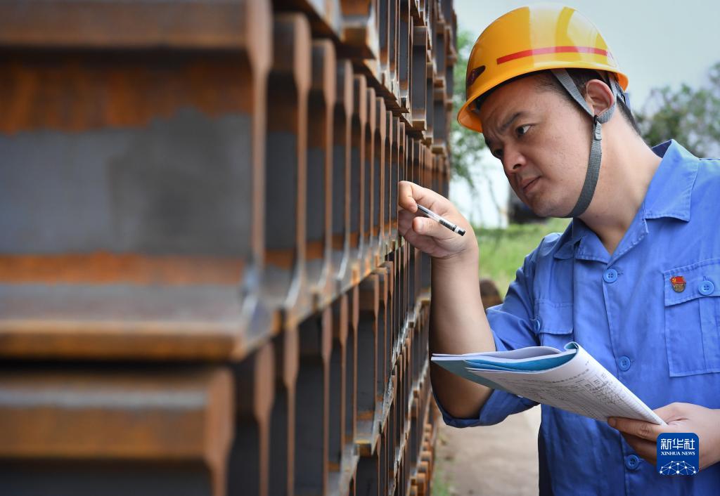 羅宇航在鄭州工務(wù)機械段焊軌車(chē)間檢查鋼軌母材(9月9日攝)。