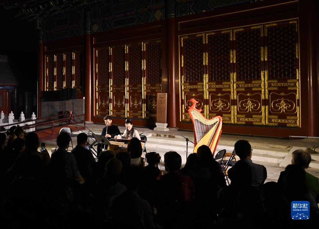 9月11日,民樂(lè )名家王溪(左)與吳茜在北京白塔寺內演出。