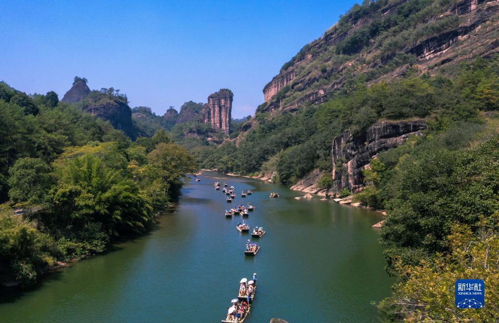 9月11日,在福建武夷山國家公園,游客乘竹筏游覽九曲溪(無(wú)人機照片)。新華社發(fā)(陳穎 攝)
