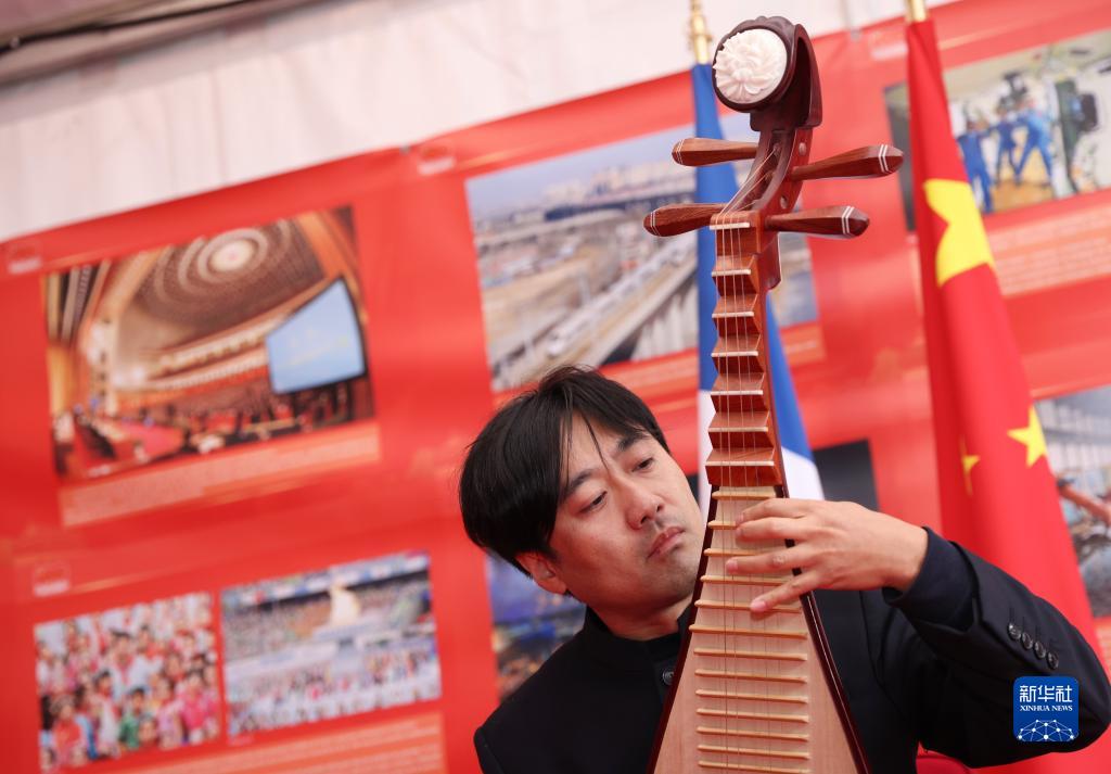 9月10日,在法國巴黎近郊舉辦的法國共產(chǎn)黨《人道報》節上,藝術(shù)家在中國館中秋專(zhuān)場(chǎng)活動(dòng)上演奏琵琶。