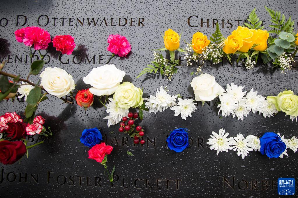 9月11日,在美國紐約的“9·11”紀念廣場(chǎng),鮮花擺放在紀念池邊刻有遇難者姓名的銅牌上。