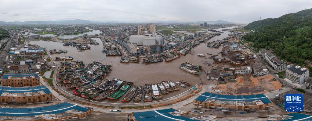 9月13日,漁船停泊在浙江省龍港市舥艚避風(fēng)港躲避臺風(fēng)(無(wú)人機照片)。