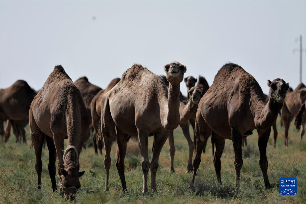 這是8月13日在哈薩克斯坦南部城市圖爾克斯坦拍攝的與哈薩克斯坦金駱駝集團有限公司開(kāi)展合作的駱駝養殖戶(hù)的駱駝群。新華社發(fā)(奧斯帕諾夫 攝)