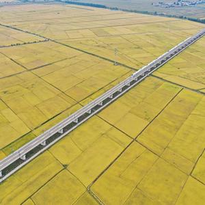 高鐵列車(chē)從吉林省公主嶺市沃野間駛過(guò)(2021年9月19日攝,無(wú)人機照片)。新華社記者 張楠 攝