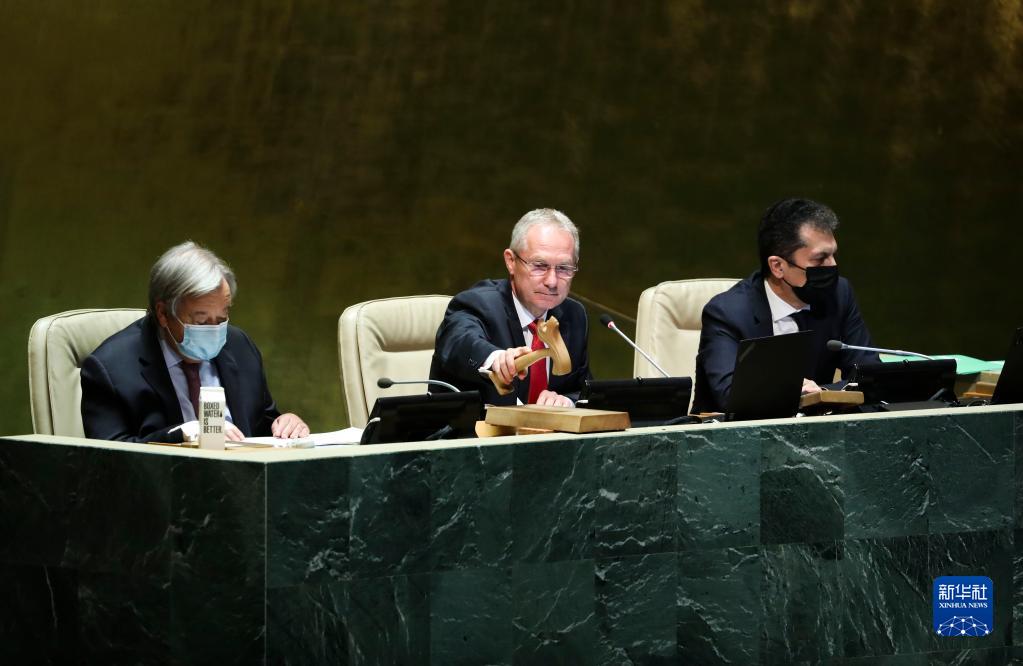 9月13日,在位于紐約的聯(lián)合國總部,第77屆聯(lián)合國大會(huì )主席克勒希(中)主持會(huì )議。
