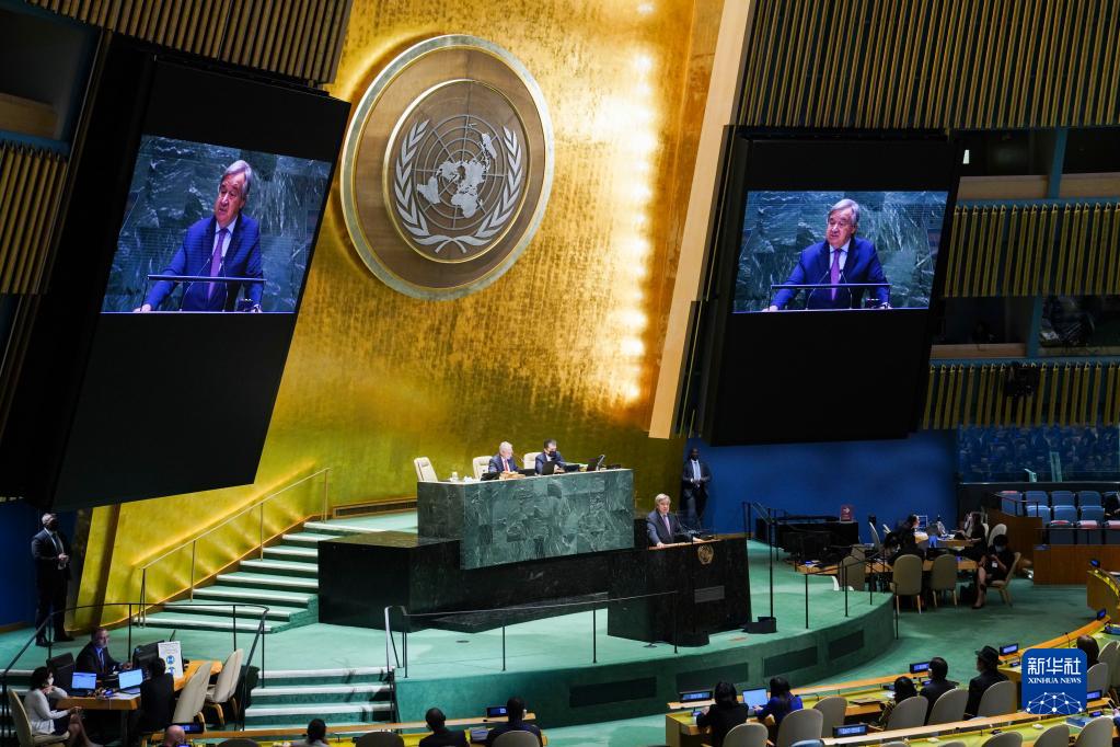 9月13日,在位于紐約的聯(lián)合國總部,聯(lián)合國秘書(shū)長(cháng)古特雷斯在第77屆聯(lián)合國大會(huì )第一次全會(huì )上致辭。