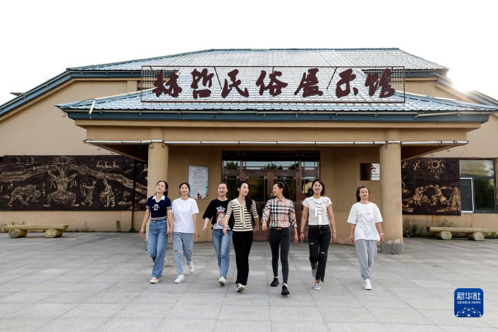 9月4日,在黑龍江撫遠市烏蘇鎮抓吉赫哲族村赫哲民俗展示館前,尚美含(左四)和赫哲族女孩一起做形體訓練。