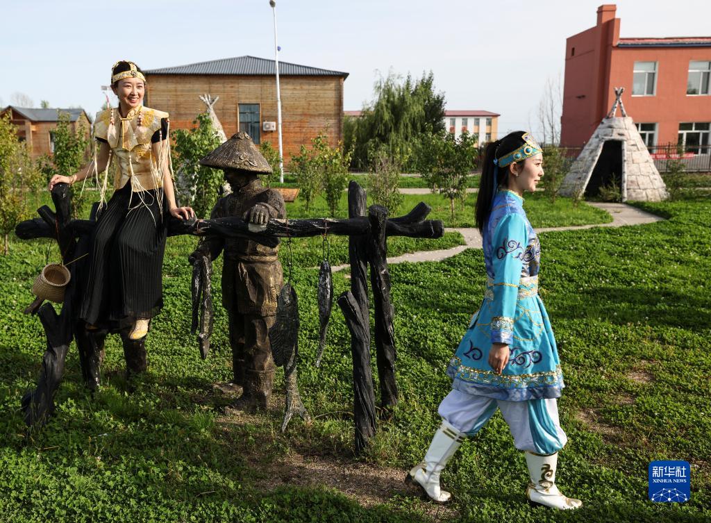 9月4日,在黑龍江撫遠市烏蘇鎮抓吉赫哲族村,尚美含(右)在排練間隙休息。