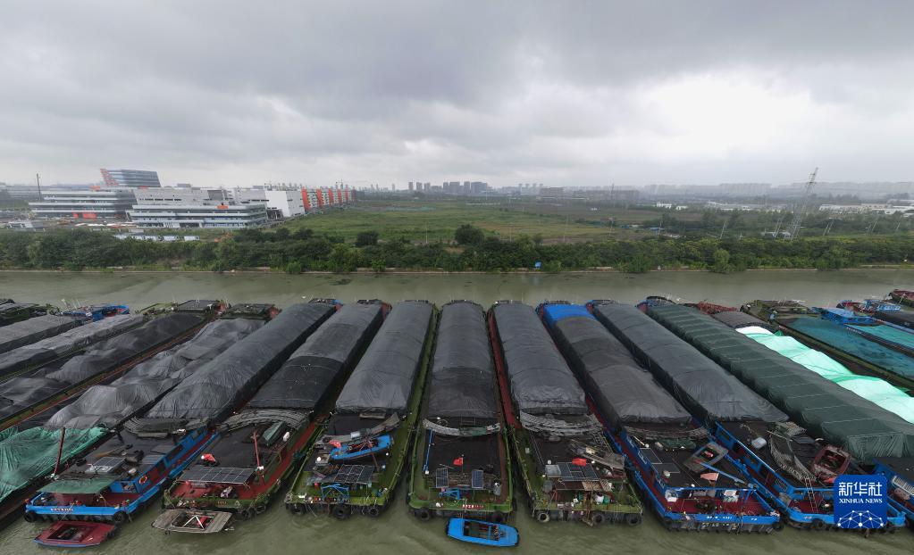 9月14日,在京杭大運河江蘇揚州段,眾多船只停泊避風(fēng)(無(wú)人機照片)。
