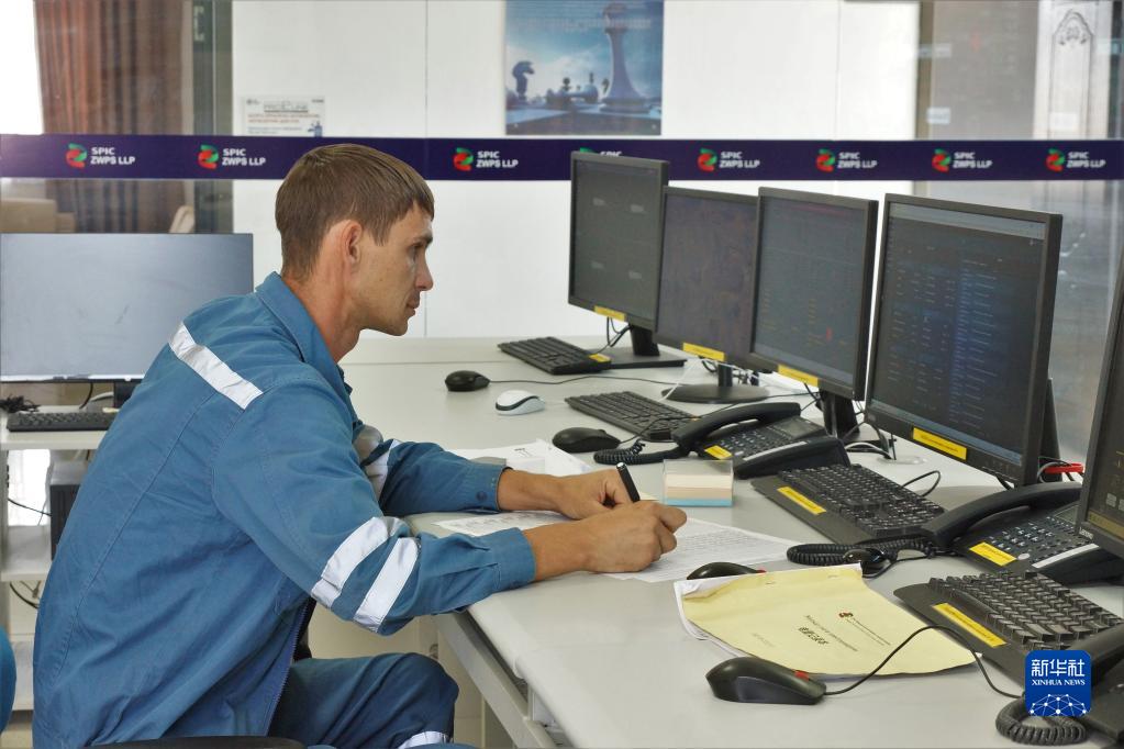 9月13日,哈薩克斯坦札納塔斯風(fēng)電場(chǎng)控制中心員工監控風(fēng)機的運行。