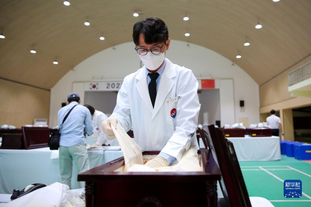 9月15日,在韓國仁川,韓方工作人員將志愿軍烈士遺骸入殮。