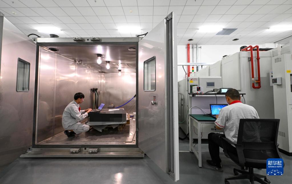 9月14日,在中汽中心新能源汽車(chē)科技創(chuàng )新基地能源系統部,工作人員準備某商用車(chē)動(dòng)力電池組環(huán)境適應性試驗。