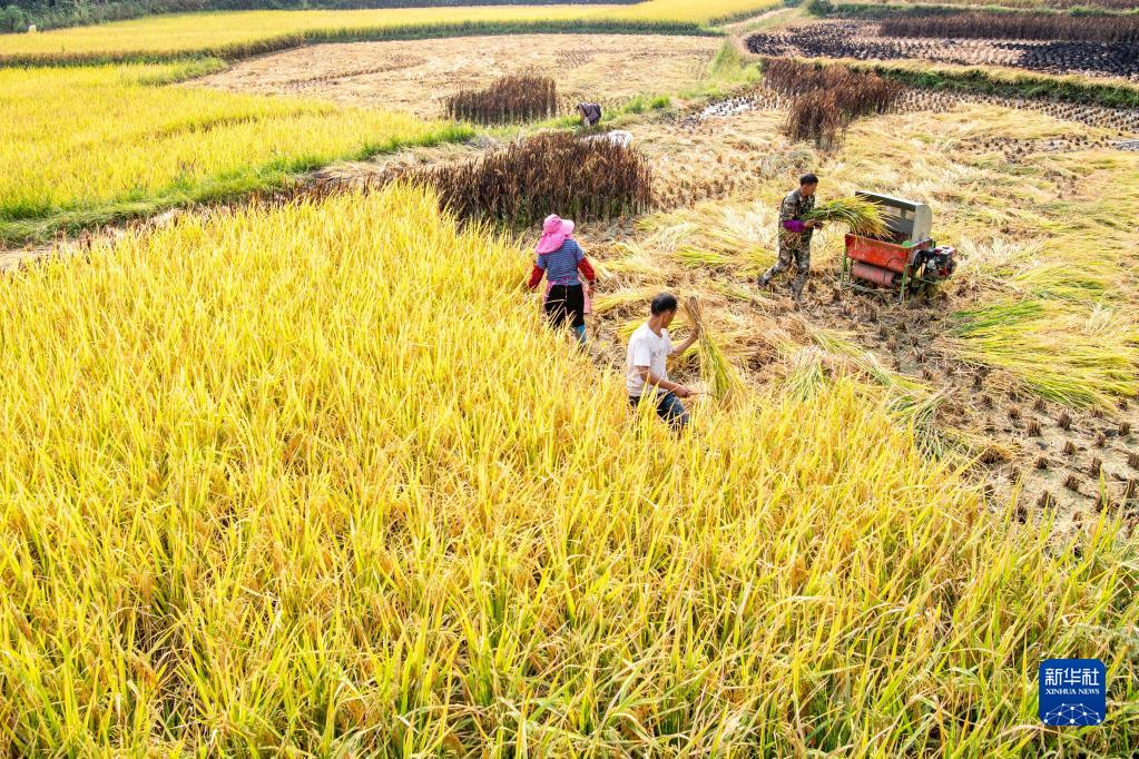9月14日,在重慶市酉陽(yáng)土家族苗族自治縣花田鄉,稻農在稻田里搶收稻谷。 新華社記者 唐奕 攝