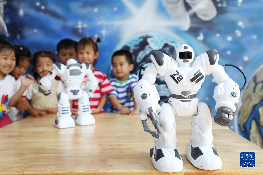 9月15日,河北省唐山市豐潤區一幼兒園的小朋友在觀(guān)看機器人表演。
