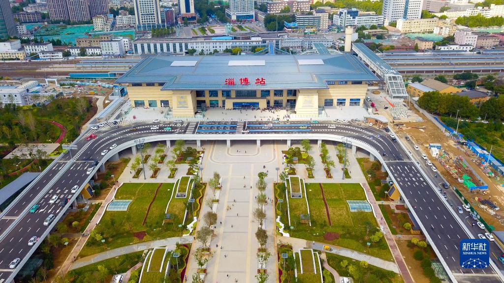 這是9月16日拍攝的新建淄博站南站房及南廣場(chǎng)交通樞紐工程(無(wú)人機照片)。