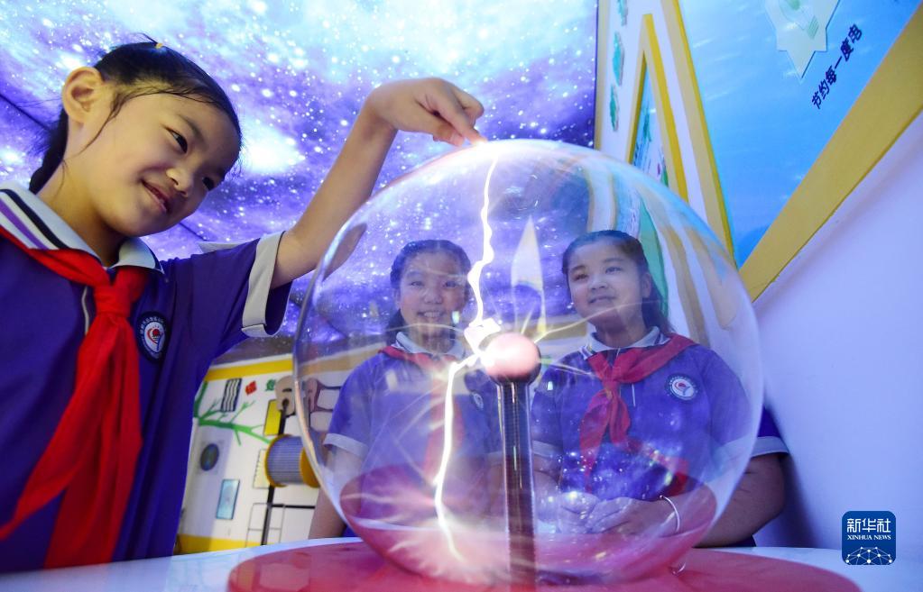 9月16日,河北省邯鄲市叢臺區叢陽(yáng)小學(xué)的學(xué)生在校園科技館體驗“輝光球”。