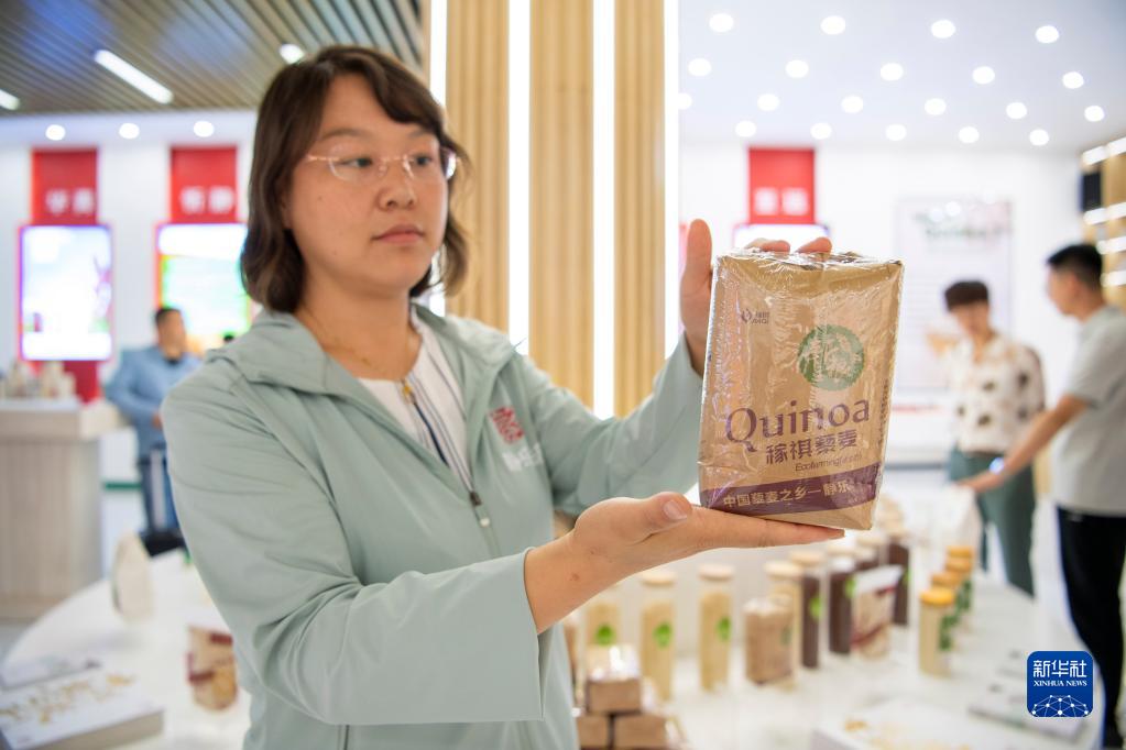 在靜樂(lè )縣中國藜麥之鄉產(chǎn)業(yè)園,工作人員展示一款藜麥產(chǎn)品(9月15日攝)。