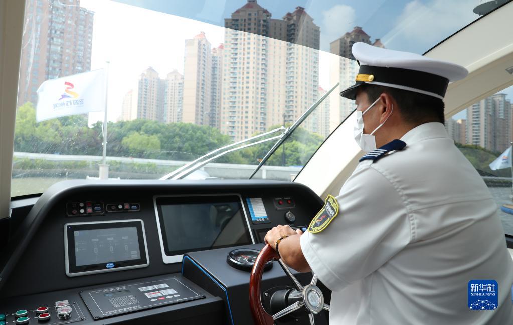 9月17日,在上海長(cháng)風(fēng)公園碼頭,駕駛員操作旅游觀(guān)光船準備啟航。