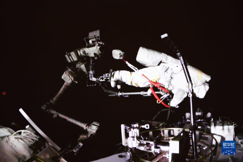 9月17日在北京航天飛行控制中心拍攝的神舟十四號航天員蔡旭哲在艙外操作的畫(huà)面。