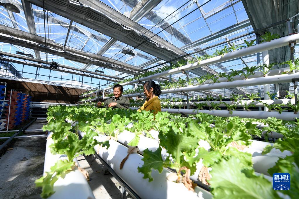農民在興十四村現代農業(yè)示范園區大棚溫室中管理無(wú)土栽培蔬菜(9月16日攝)。