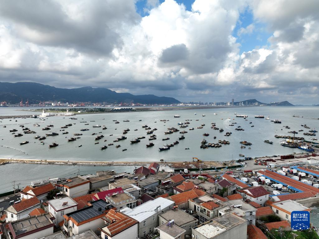 漁船停泊在江蘇省連云港市連島中心漁港碼頭港灣躲避臺風(fēng)“梅花”(9月13日攝,無(wú)人機照片)。