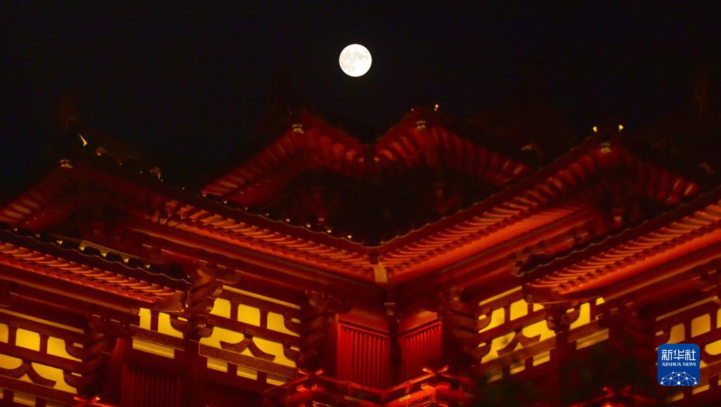 這是農歷八月十五中秋節在河南省洛陽(yáng)市隋唐洛陽(yáng)城國家遺址公園應天門(mén)遺址博物館拍攝的圓月(9月10日攝)。