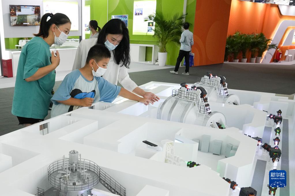 9月17日,在2022年全國大眾創(chuàng )業(yè)萬(wàn)眾創(chuàng )新活動(dòng)周合肥主會(huì )場(chǎng)的主題展區,家長(cháng)帶著(zhù)孩子參觀(guān)超導回旋質(zhì)子治療系統模型。