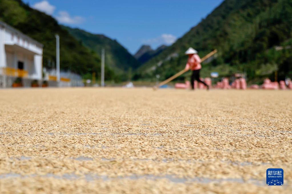 9月18日,貴州省黔南布依族苗族自治州羅甸縣逢亭鎮祥腳村的村民在晾曬稻谷。