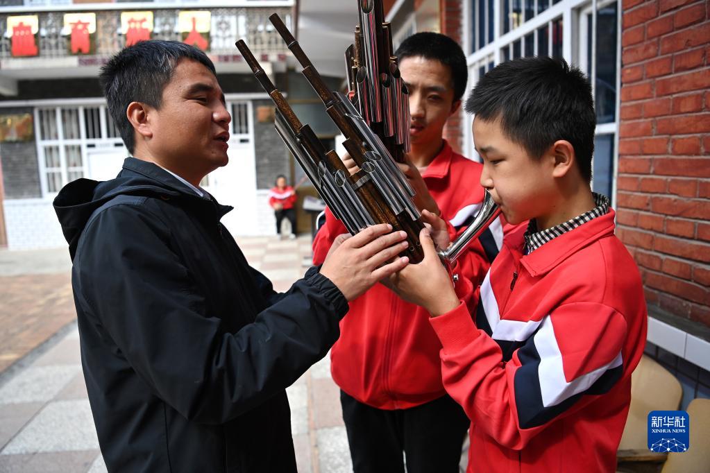 在陵川縣盲人曲藝宣傳隊院子里,老隊員張學(xué)敏(左)指導小隊員練習樂(lè )器(9月15日攝)。