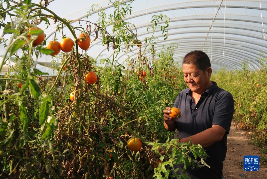 9月17日,內蒙古五原縣種植大戶(hù)邢雷在和勝鄉黃柿子現代科技產(chǎn)業(yè)示范園采摘黃柿子。