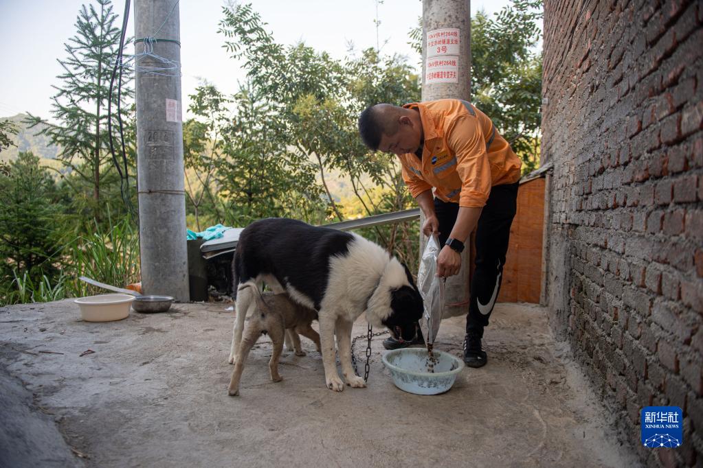 9月19日,看守員趙偉燈在赤嶺隧道防洪值守點(diǎn)投喂寵物狗。深山里的值守點(diǎn)人煙稀少,寵物狗是看守員們值守期間僅有的伙伴。