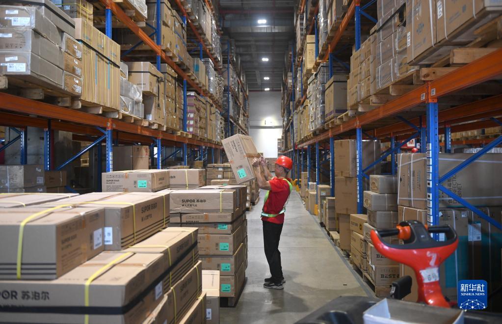 工作人員在位于廣州市開(kāi)發(fā)區的京東倉庫里搬運快遞包裹(9月15日攝)。
