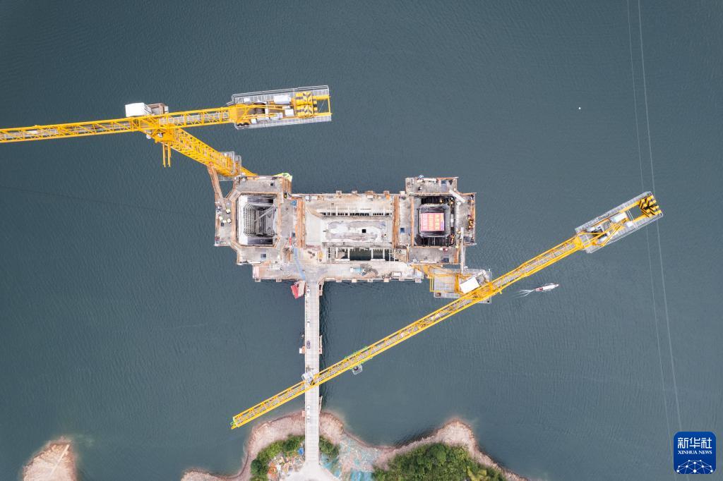 當日,官(莊)新(化)高速全線(xiàn)重點(diǎn)控制性工程馬路口資水特大橋主墩封頂,即將進(jìn)入橋梁上構施工階段,為早日通車(chē)運行奠定了基礎。馬路口資水特大橋位于湖南省益陽(yáng)市安化縣柘溪水庫內,全長(cháng)1187米,主跨500米,其中水中主塔高202.4米。