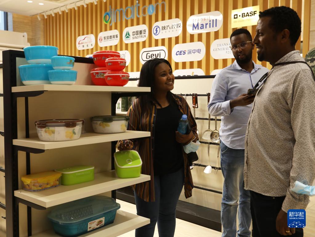 9月14日,在吉布提國際自貿區,非洲創(chuàng )業(yè)青年在跨境電商平臺商品展示區交流。