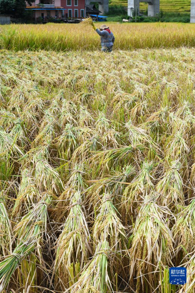 9月10日,云南勐臘縣關(guān)累鎮勐遠村農民在田間收割水稻。