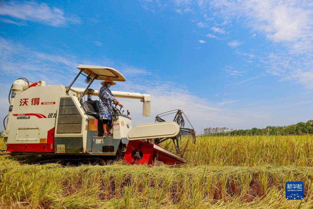 9月11日,江西省吉安市峽江縣水邊鎮何君村,村民駕駛收割機收割水稻。