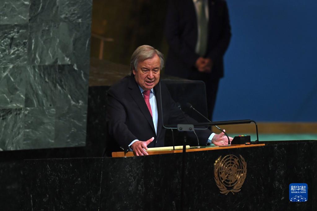 9月20日,在位于紐約的聯(lián)合國總部,聯(lián)合國秘書(shū)長(cháng)古特雷斯在第77屆聯(lián)合國大會(huì )一般性辯論開(kāi)幕式上致辭。