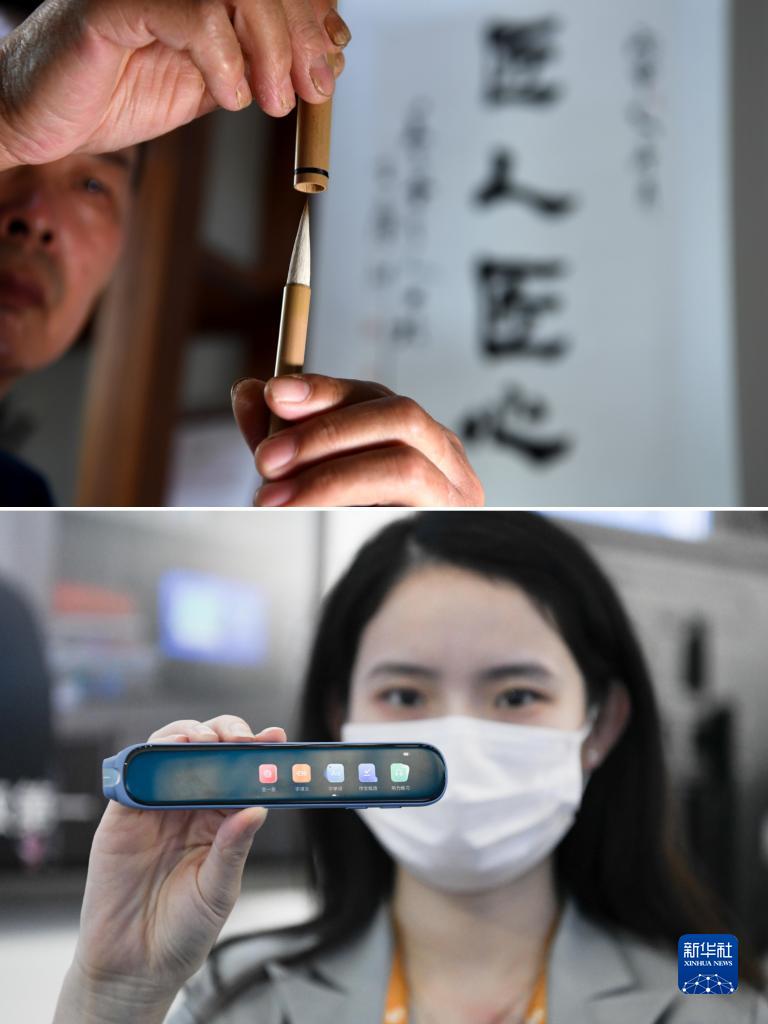 這是一張拼版照片:上圖為國家級非物質(zhì)文化遺產(chǎn)“宣筆制作技藝”代表性傳承人佘征軍在涇縣“守藝人”工作室展示自己制作的宣筆(新華社記者韓曉雨2020年6月5日攝);下圖為2022世界制造業(yè)大會(huì )上工作人員展示科大訊飛生產(chǎn)的一款AI翻譯筆(新華社記者張端2022年9月20日攝)。