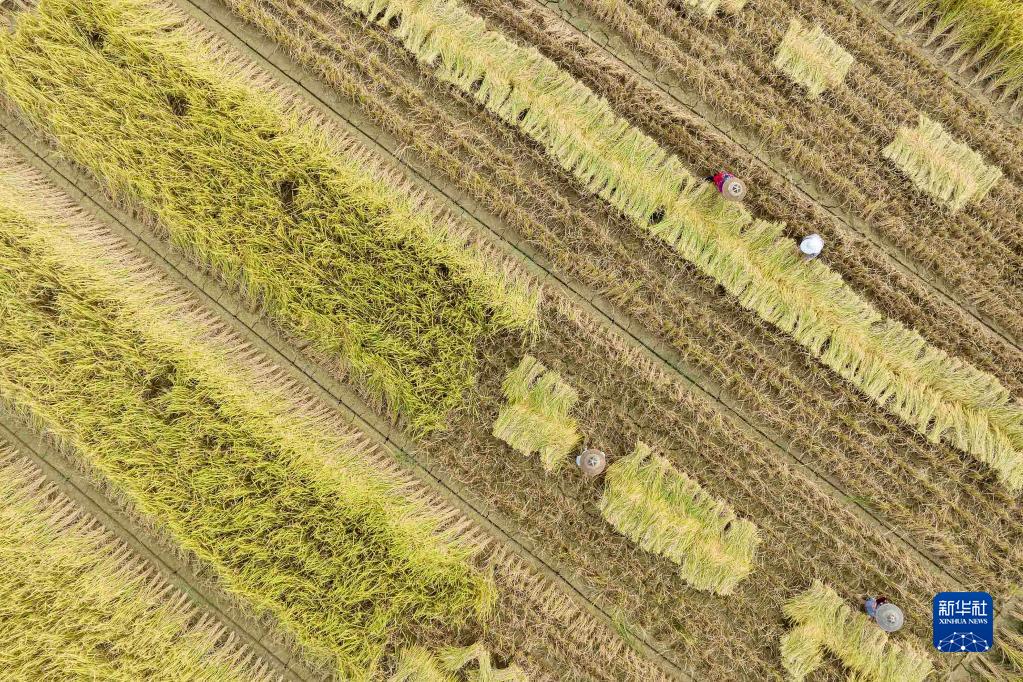 9月21日,貴州省黔東南苗族侗族自治州錦屏縣敦寨鎮亮司村的村民在搶收稻谷(無(wú)人機照片)。