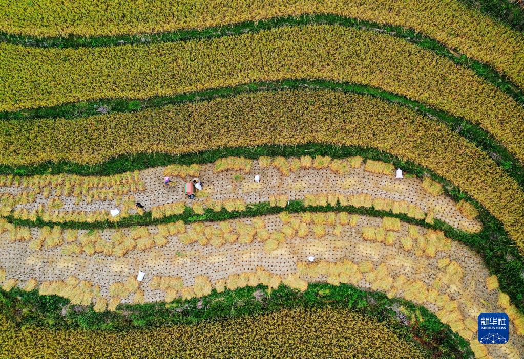 9月21日,貴州省黔南布依族苗族自治州福泉市牛場(chǎng)鎮雙龍村村民在稻田里收割水稻(無(wú)人機照片)。