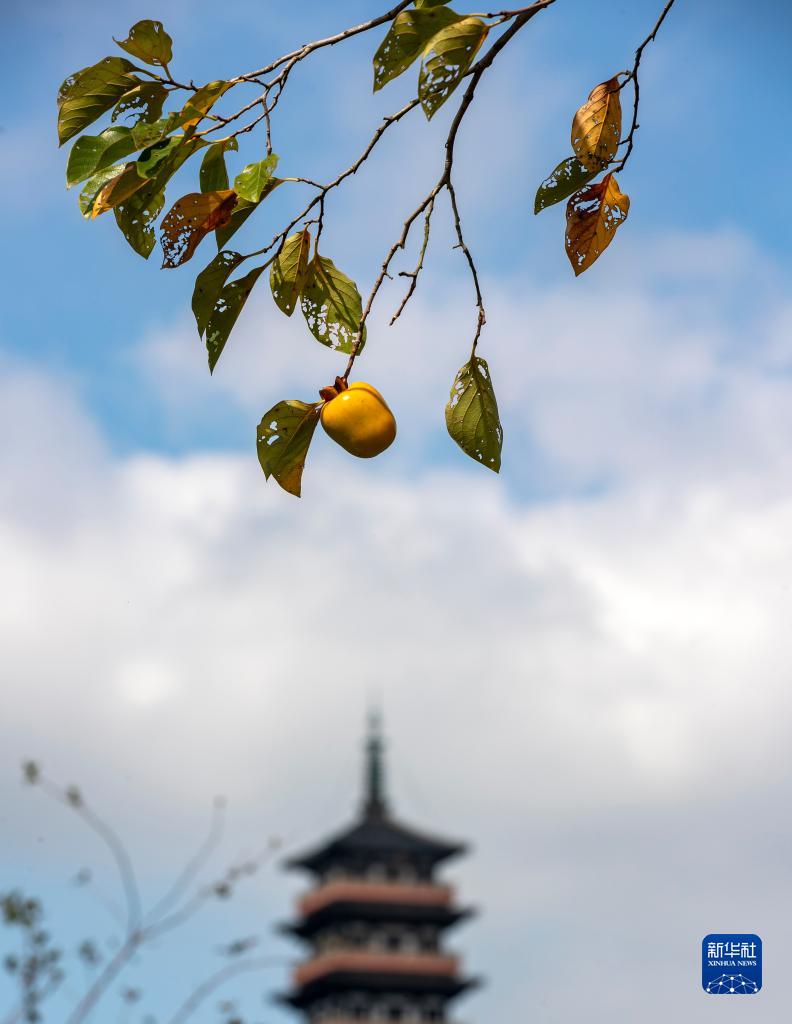 江蘇省揚州市瘦西湖風(fēng)景區,成熟的柿子與棲靈塔相映成趣(9月18日攝)。